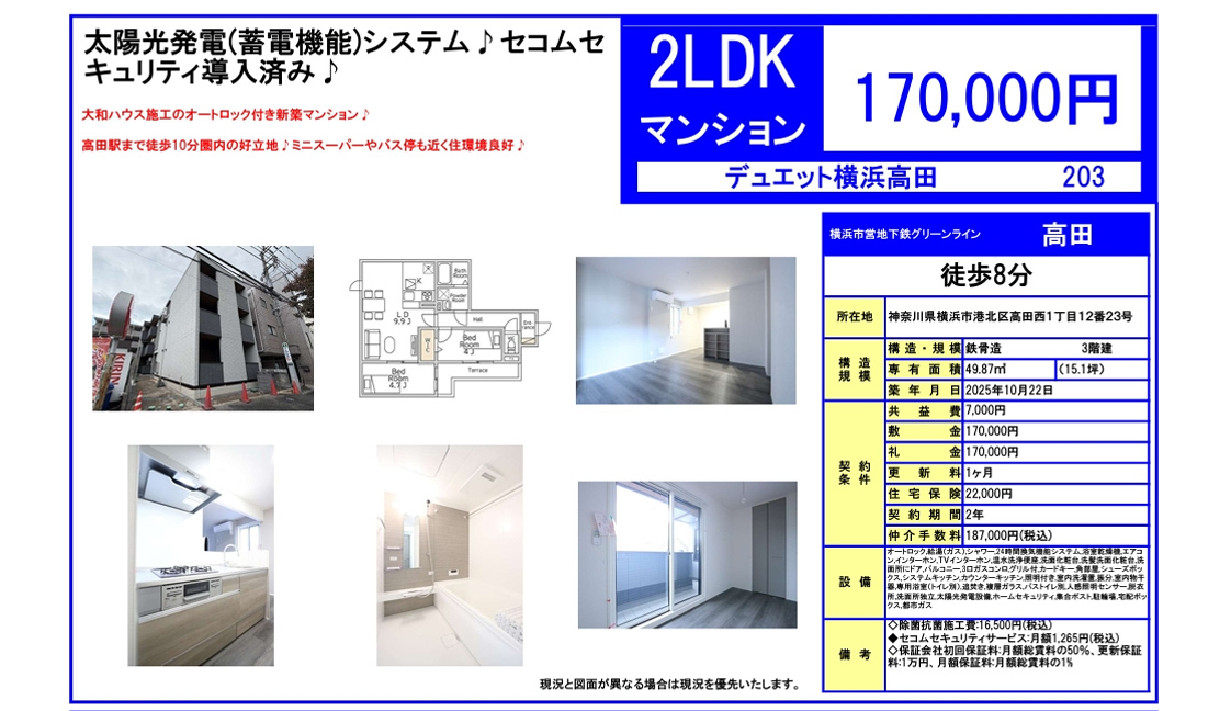 ◇除菌抗菌施工費:16,500円(税込)  ◆セコムセキュリティサービス:月額1,265円(税込) ◇保証会社初回保証料:月額総賃料の50%、更新保証料:1万円、月額保証料:月額総賃料の1%