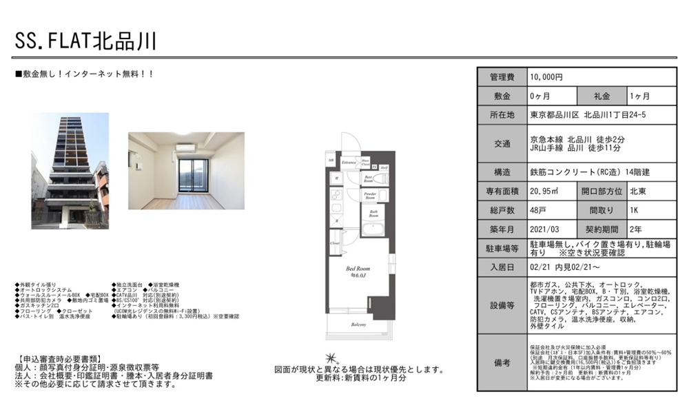 | 備考 | 保証会社及び火災保険に加入必須 保証会社(エポス・日本SF)加入条件有:賃料+管理費の50%~60% (別途 月次保証料、口座振替手数料、更新保証料等有り) 入居時に鍵交換費用(16,500円(税込))をご負担頂きます ※短期違約金有(1年以内賃料・管理費1ヶ月分) |