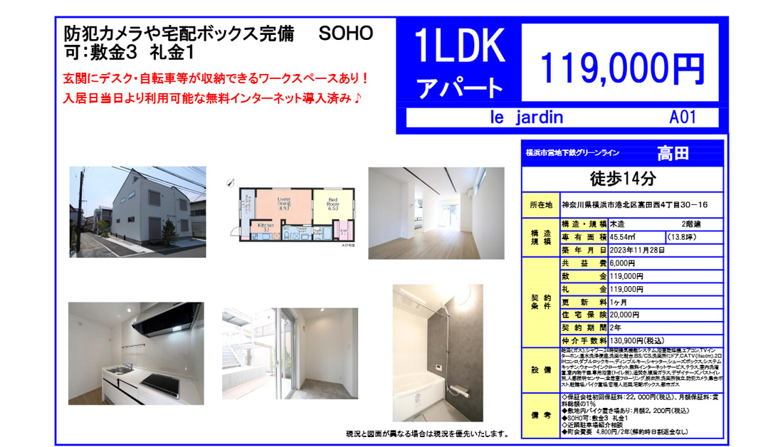 備考 ◇保証会社初回保証料:22,000円(税込)、月額保証料:賃料総額の1%
